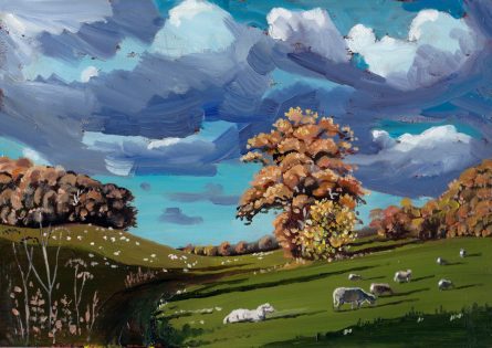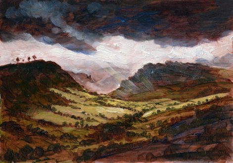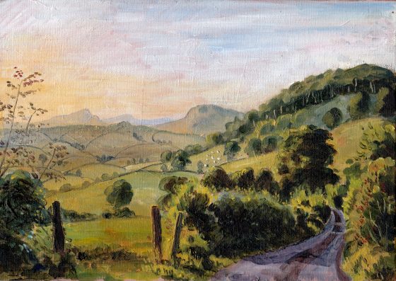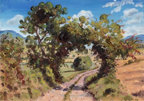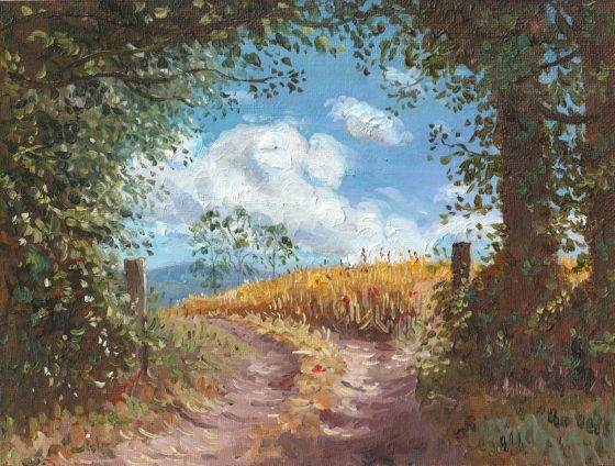 The lane from Box Farm down to Trevonny, near Skenfrith, Monmouthshire, oil, August 2023.