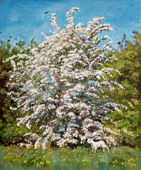May tree and cows parsley at Eaton Bishop, evening, oil, painted rapidly the following evening, May 2025