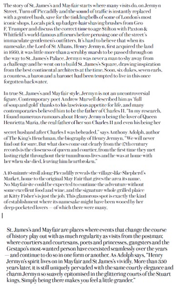 … a passionately committed and scholarly study of one of the Stuarts’ more illustrious henchmen, complete with detailed notes on sources that have never previously been brought together…. Anthony Adolph’s book has not been through the usual publishing mill because he has had to publish it himself, and he has made a very good job of it… How many of those who, today, buy expensive shirts and shaving brushes in Jermyn Street know to whose taste and indomitable enterprise we owe the street itself? Let’s hope this book is on sale there too! – Gillian Tindall, “West End Wonders”, Literary Review, June 2007, pp. 47-8.